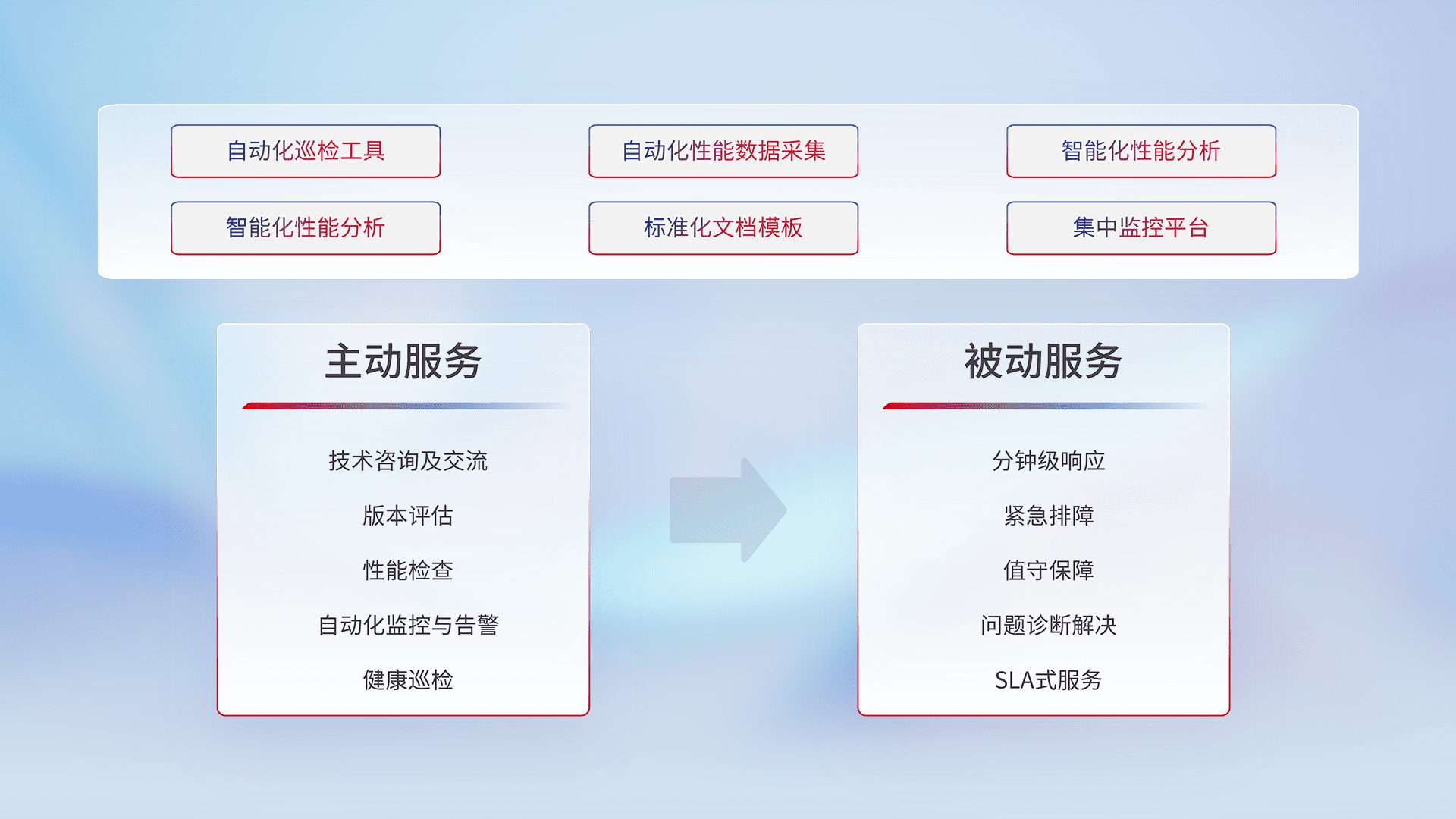 智能化工具和标准化文档,,,保障服务质量,,,,提供主动服务(包含技术咨询、、、、版本评估、、、性能检查、、、自动化监控与告警、、、健康巡检)和被动服务包含(分钟级响应、、、、紧急排障、、、值守保障、、、、问题诊断解决、、、、SLA服务)。。
